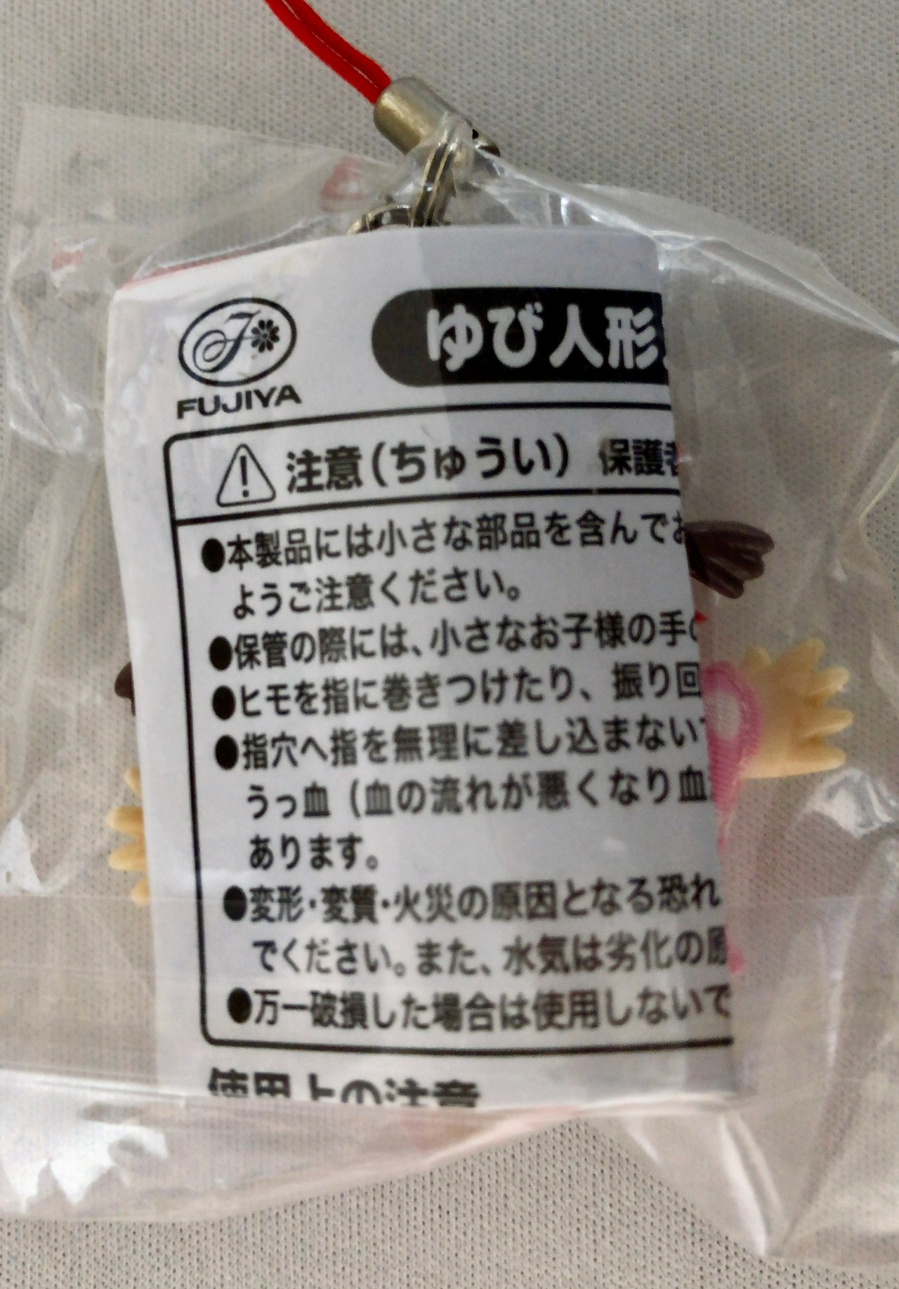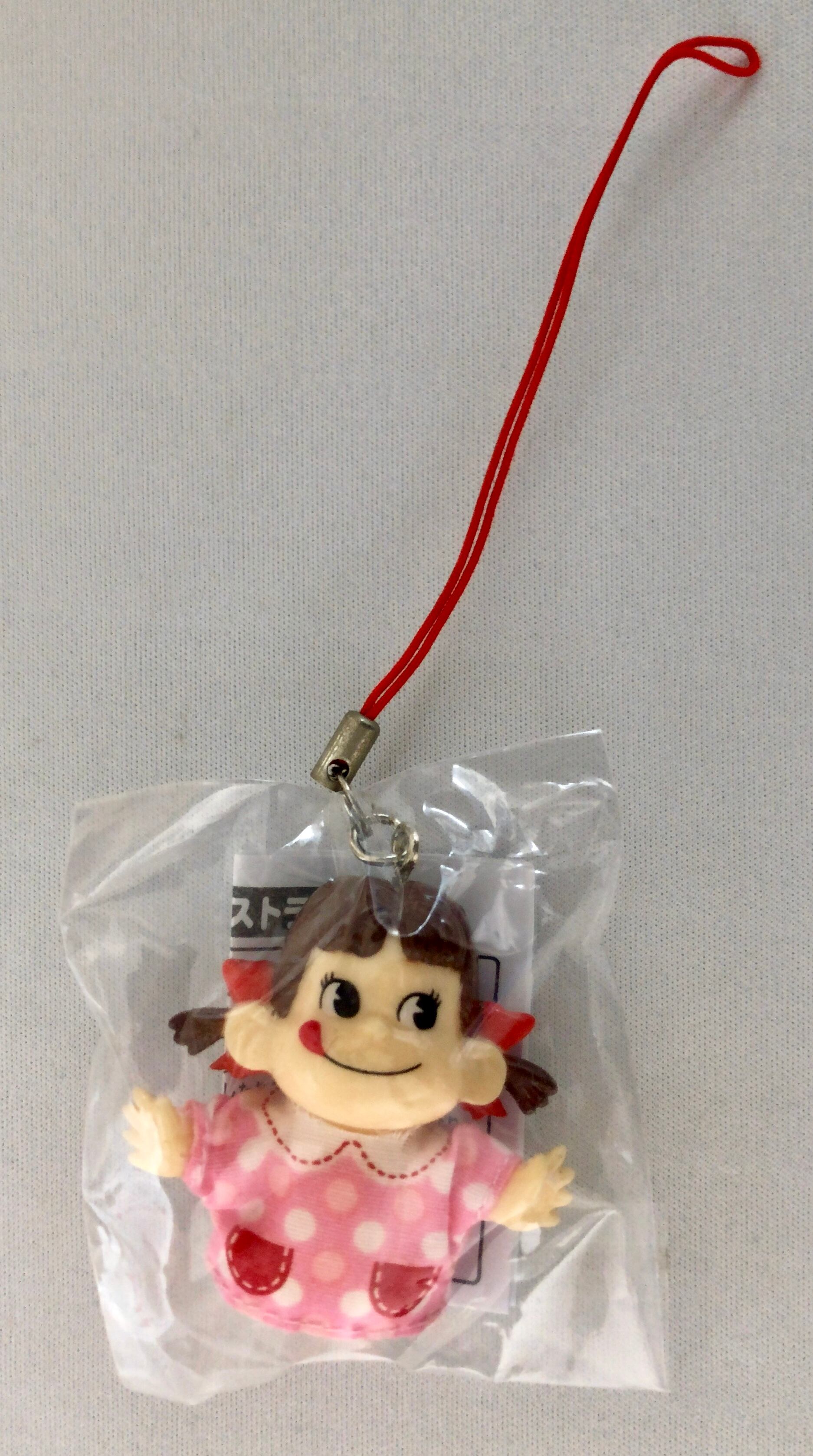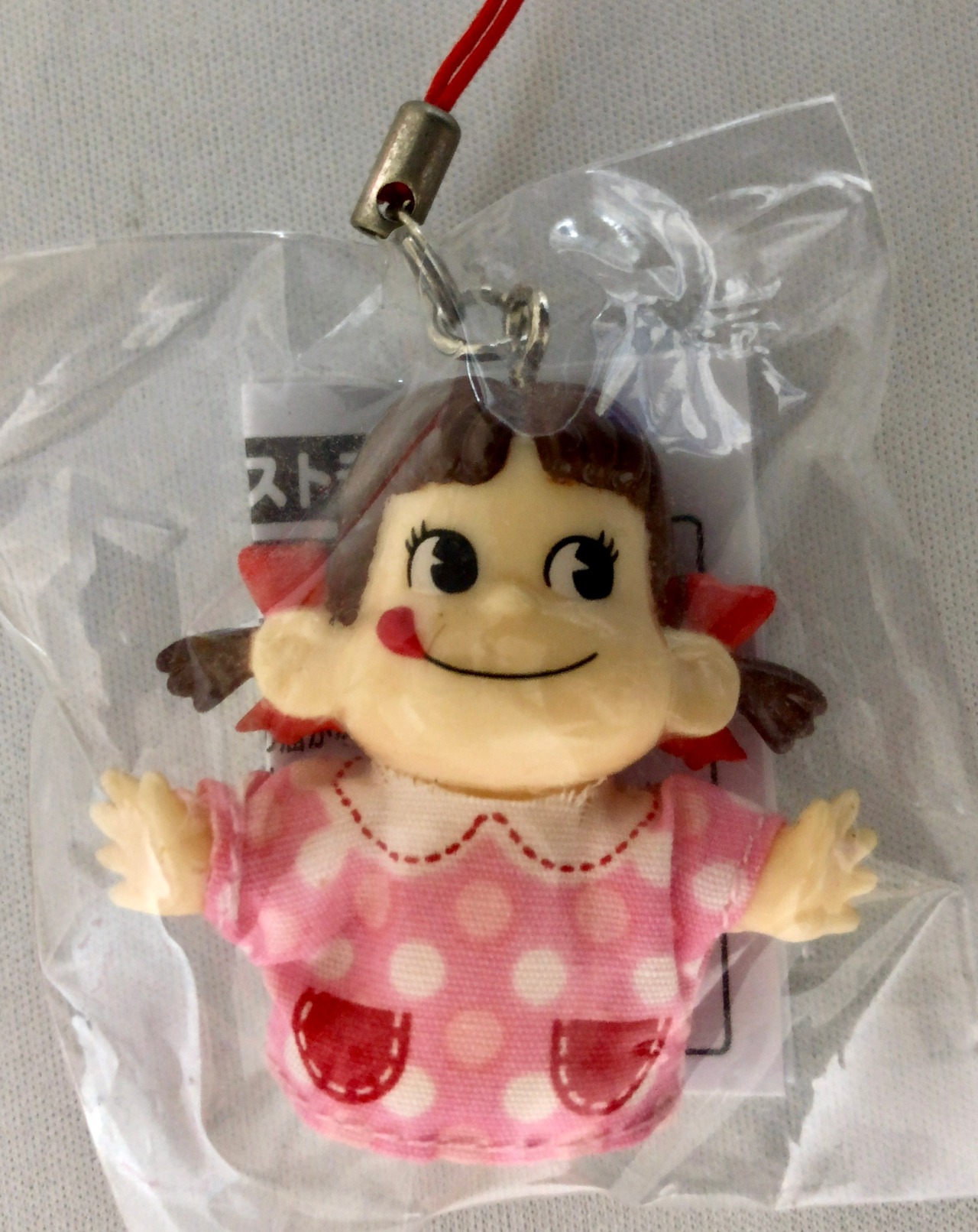 不二家のペコちゃんの指人形ストラップ。